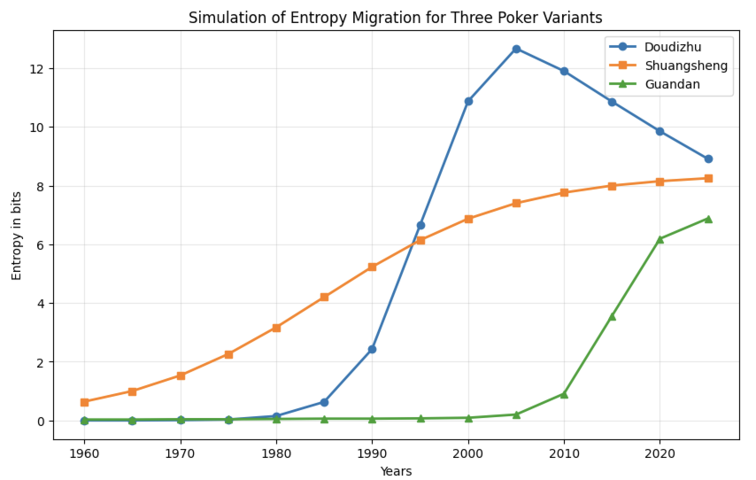 - 斗地主(高熵轨迹):早期近0(局部),1990s急升(L(t)陡峭,匹配互联网“分支爆炸”),2000s峰值12.67 bits(行动~10^4,策略深),后衰至8.91(D(t)拉低,竞技niche化)。变迁:高k驱动“病毒式”全国化,但高E易疲劳(社会熵峰后回落)。